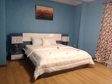 Nestled in Nyom - Yaoundé, The Blue Resort offers a tranquil oasis where you can indulge in the finer things in life. Enjoy our beautifully furnished apartments, cool off in the pool, sip on refreshing cocktails at the bar, savor our delectable Cameroon/American cuisine, and rejuvenate at the on-site gym. Whether you're celebrating a special occasion or simply seeking a restful retreat, our secure and conveniently located resort provides the perfect setting for you and your loved ones to create cherished memories.